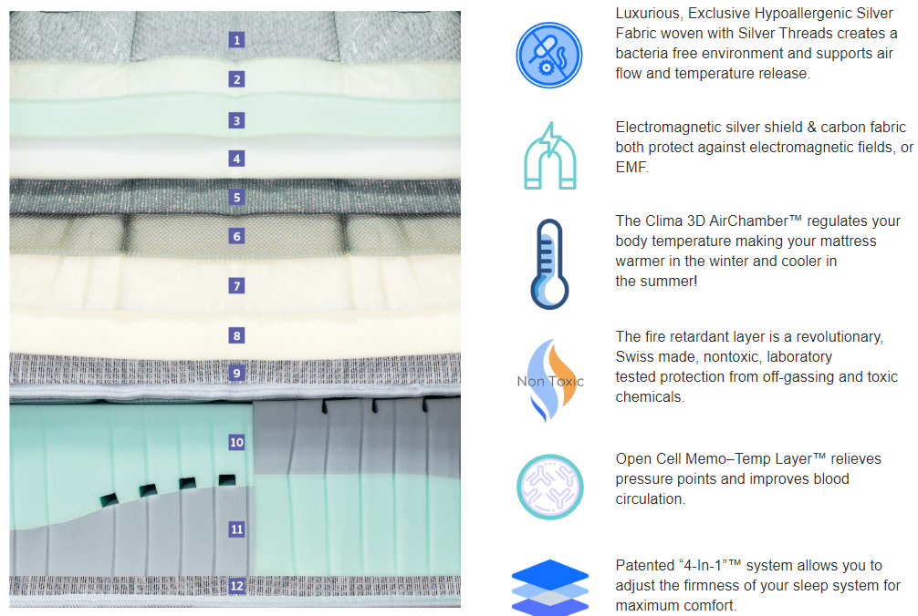 Patented Hypo-Allergenic Silver Sleep Collection PLUS w/exclusive Grounding technology… is the result of years of research and testing and is the only orthopedic, hypo-allergenic sleep system that you can adjust to four different comfort settings. This innovative mattress is made from the finest materials and adapts to the shape of your body in every position, keeping your spinal column in perfect alignment. Perfect for the back, side and stomach sleeper. The special foam promotes ventilation, keeping you cool in the summer and warm in the winter. Our state of the art EMF Silver Shield eliminates harmful EMF radiation from TV’s, cell phone chargers, WiFi routers, computers and even the power lines in your walls. This patented grounding system helps neutralize free radicals to give your body the rejuvenating rest it deserves. With all of the unprecedented features and the life enhancing benefits they provide, it’s no wonder this product is in such high demand. Exceptional Warranty available.
